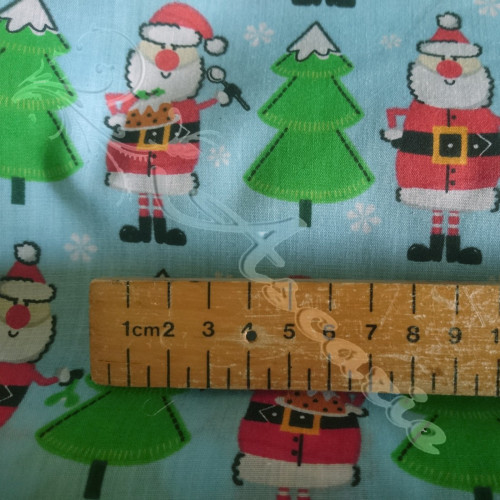 Father Christmas with Christmas Trees on a blue background Polycotton Print